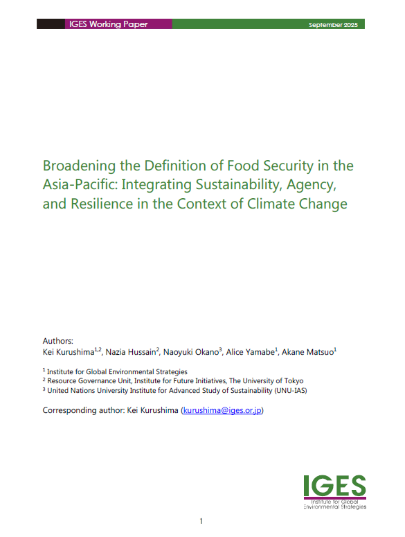 Climate change not only has a direct impact on human society and nature, but there are also socioeconomic risks that threaten humankind. Climate security examines the responses to the risks of climate change, and is a topic that has gained much attention and generated various discussions in Europe and the United States. However, it is a relatively new concept in Japan and the wider Asia-Pacific region. IGES has been working to establish a perspective on climate security across the region since last year under the "Climate Security in Asia and the Pacific Project" funded by the Ministry of Foreign Affairs of Japan (MOFA). The project aims to provide an overview of climate security and address the diversity and continuity of the climate change issue by establishing five themes: energy security, human mobility, food security, climate change adaptation, and maritime security, and to make policy recommendations from multiple perspectives. This session will focus on two themes: food security and human mobility. After an overview of the discussions in the international community on each theme, the session will present efforts being made in the Asia-Pacific, especially in Japan, and discuss how these two themes are linked, aiming to contribute to the development of the discussion on climate security in the Asia-Pacific.